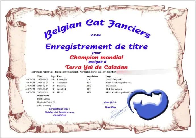 Terra Yaï CalaDaN behaalt een CACE en Raven Merlina des Cailloux Enchantés behaalt haar 3e CAC. Ze wordt kampioen.